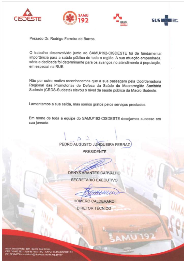 Carta de agrtadecimento do CISDESTE ao  Coordenador Regional das Promotorias de Justiça de Defesa da Saúde do Ministério Público, promotor Rodrigo Barros janeiro 08, 2025 Publicado por: Asscom CISDESTE